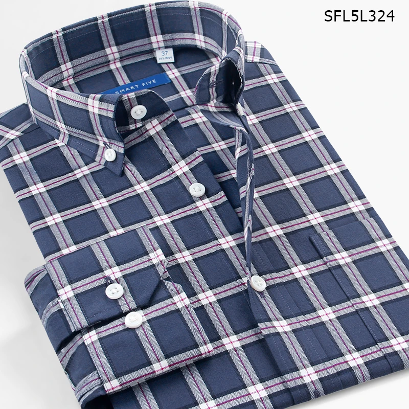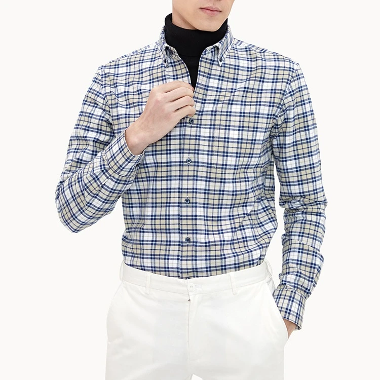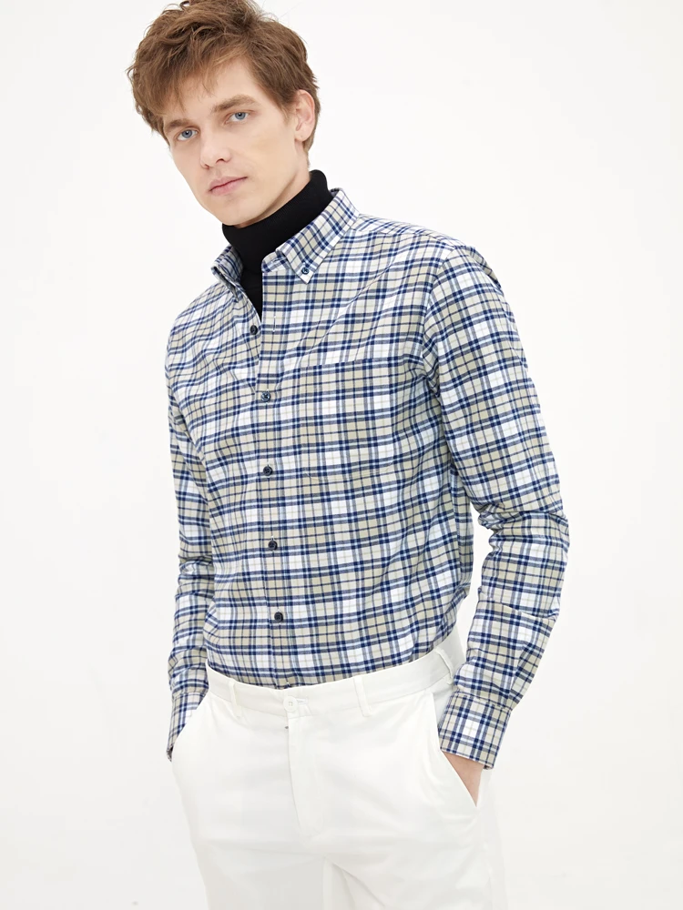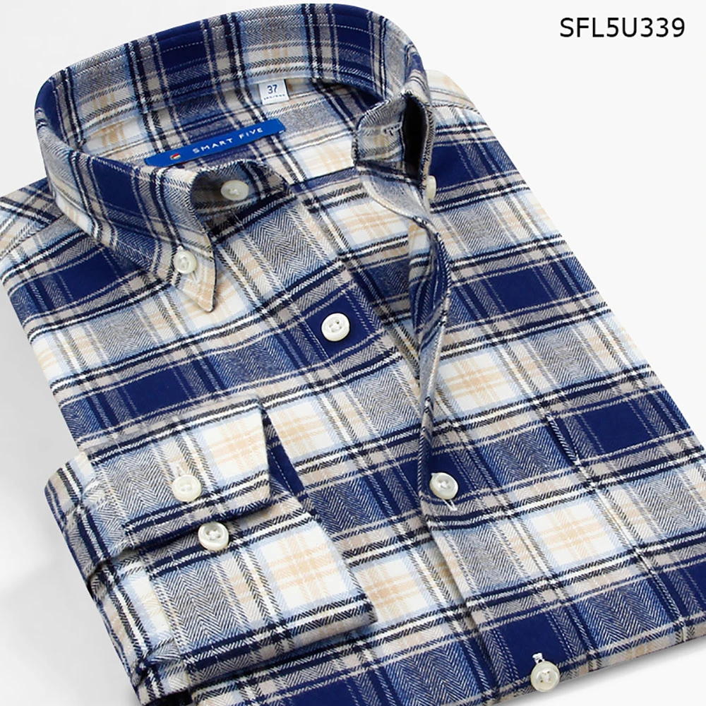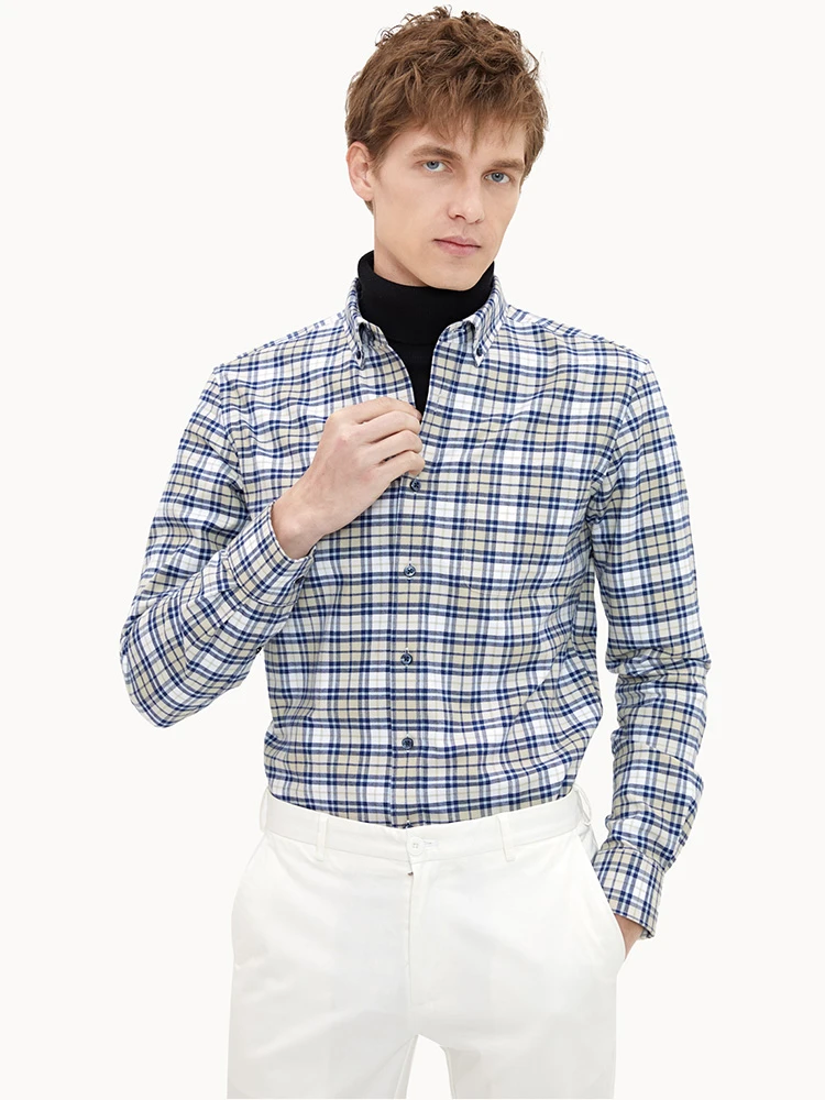 Men'S Long-Sleeved Slim Cotton Business Casual Flannel Brushed Plaid Shirt